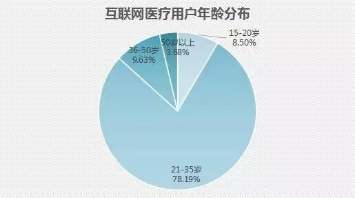 年輕網民是中國互聯網用戶的主力軍,互聯網醫療用戶的年齡分布也呈現出明顯的年輕化趨勢。21-35歲之間的用戶群體占比最高達到78.19%,36-50歲之間用戶占比9.63%,15-20歲用戶群體占比8.50%,50歲以上用戶占比3.68%。