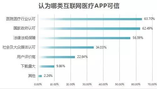 數據顯示用戶更愿意選擇醫院醫療行業認可、國家政府認可和有法律法規保障的的互聯網醫療APP,分別占比63.70%、62.49%和56.59%,擁有專業權威機構的認證已成為用戶選擇互聯網醫療APP的基礎。