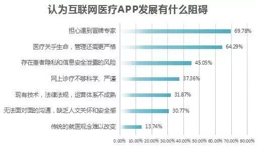 對認為互聯網醫療APP發展有什么阻礙這個問題調查中發現,用戶的觀點主要還是偏向于信任感不佳。69.78%的用戶對于互聯網的醫療專家的真實性存疑;64.29%的用戶認為醫療關乎性命,管理還需嚴格;還有45.05%的用戶擔心存在隱私信息安全泄露的風險。