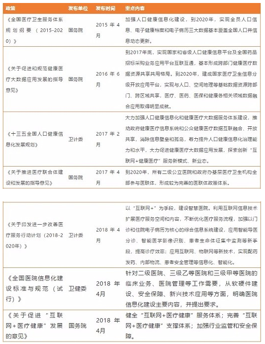 事實上,自2015年4月,國務院發布《全國醫療衛生服務體系規劃綱要(2015-2020)》,提出加強人口健康信息化建設,到2020年,實現全員人口信息、電子健康檔案和電子病歷三基本覆蓋全國人口并信息動態更新,我國陸續出臺了一系列加速醫療信息化產業發展的政策。