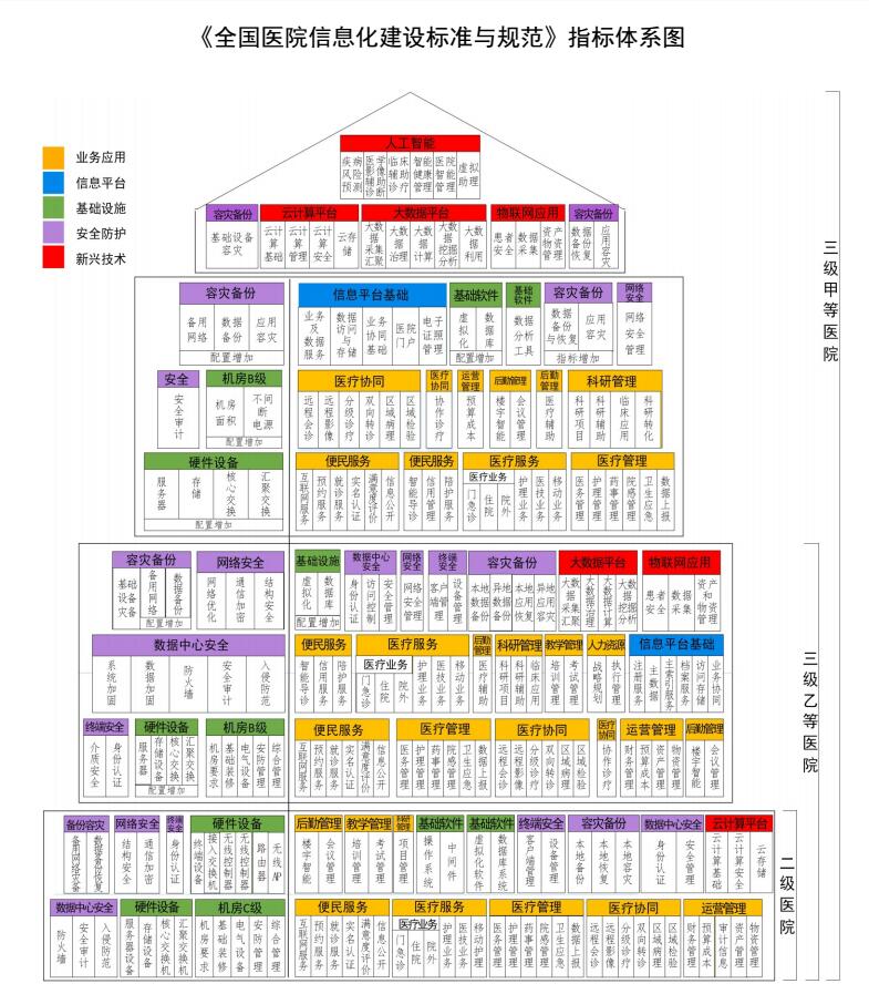 《標準與規范》針對二級醫院、三級乙等醫院和三級甲等醫院的臨床業務、醫院管理等工作需要,從軟硬件建設、安全保障、新興技術應用等方面,明確醫院信息化建設主要內容,并提出要求。《標準與規范》分為業務應用、信息平臺、基礎設施、安全防護、新興技術等5章22類262項具體內容。其中,業務應用包括便民服務、醫療服務、醫療管理、醫療協同、運營管理、后勤管理、科研管理、教學管理、人力資源管理等9類;信息平臺包括信息平臺基礎、平臺服務集成等兩類;基礎設施包括機房基礎、硬件設備、基礎軟件等3類;安全防護包括數據中心安全、終端安全、網絡安全、容災備份等4類;新興技術包括技術、云計算技術、人工智能技術、物聯網技術等4類。