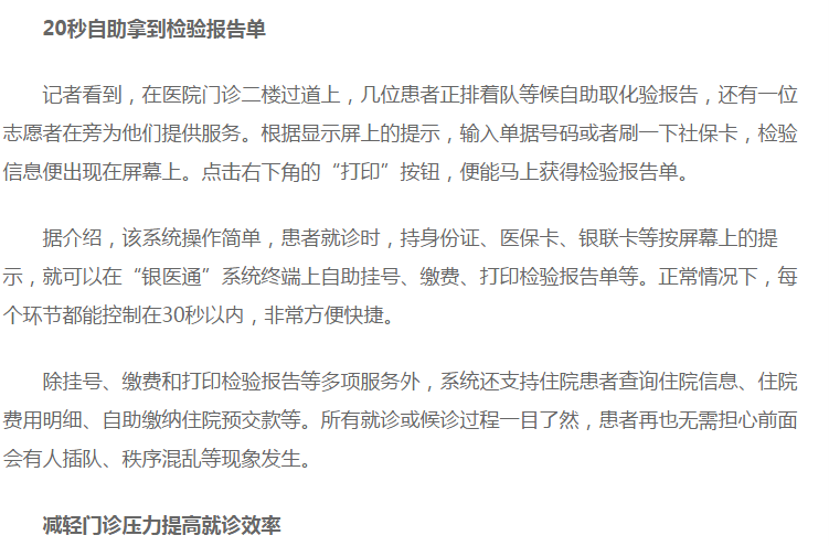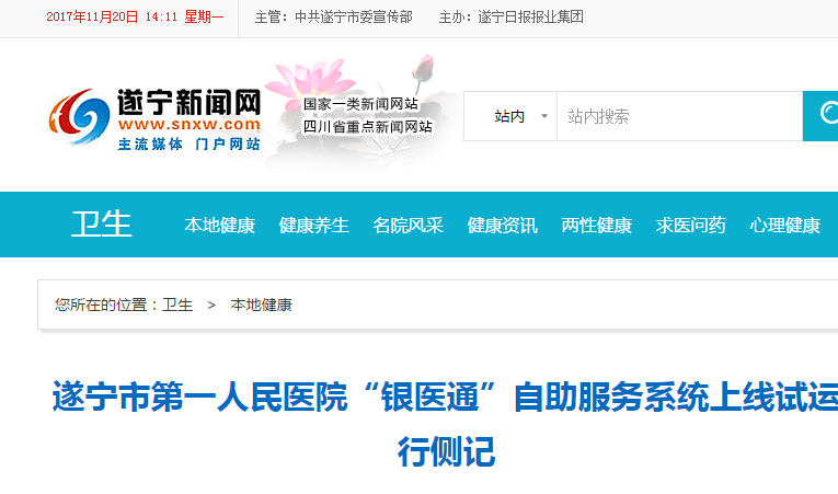 同時我司在四川遂寧市人民醫院實施的銀醫項目也進入了試運行階段,通過銀醫自助服務平臺掛號、繳費、打印報告,極大地改善了患者的就診體驗,下面是遂寧新聞網記者對患者使用銀醫平臺后的采訪。