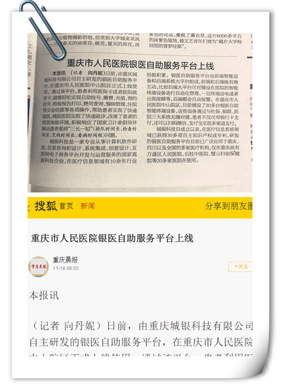 PRESS CENTENR我司在重慶市人民醫院中山院區實施的銀醫自助服務平臺已在10月底完成了項目驗收,所有設備早已投入了使用。銀醫自助服務平臺確實為患者的就醫帶來了很多便捷,有效地幫助解決患者看病“三長一短”問題,因此受到了重慶晨報的高度關注,并在2017年11月18日的重慶晨報線上新聞平臺和線下報紙都進行了相關報道。