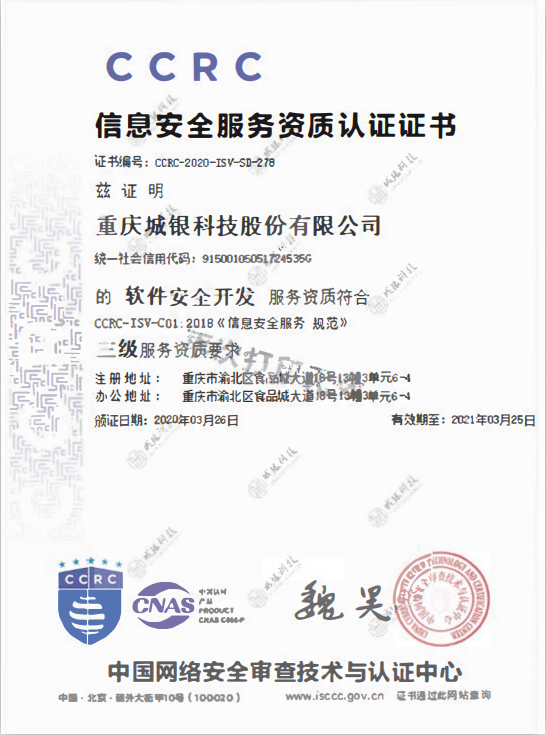 PRESS CENTENR日前,由中國網絡安全審查技術與認證中心(CCRC),依據公開的標準和程序,針對城銀股份的技術、資源、法律、管理等方面的資質和能力,以及其穩定性、可靠性進行綜合評核審定后,重慶城銀科技有限公司榮獲軟件安全開發三級服務資質及信息系統安全集成三級服務資質認證!