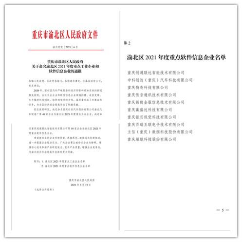 PRESS CENTENR近日,重慶市渝北區人民政府公布了2021年度重點工業企業和軟件信息企業名單,以經營狀況、人員素質、自主知識產權、研發能力、社會責任等多維度評價,經研究決定命名我司為渝北區2021年度重點軟件信息企業。