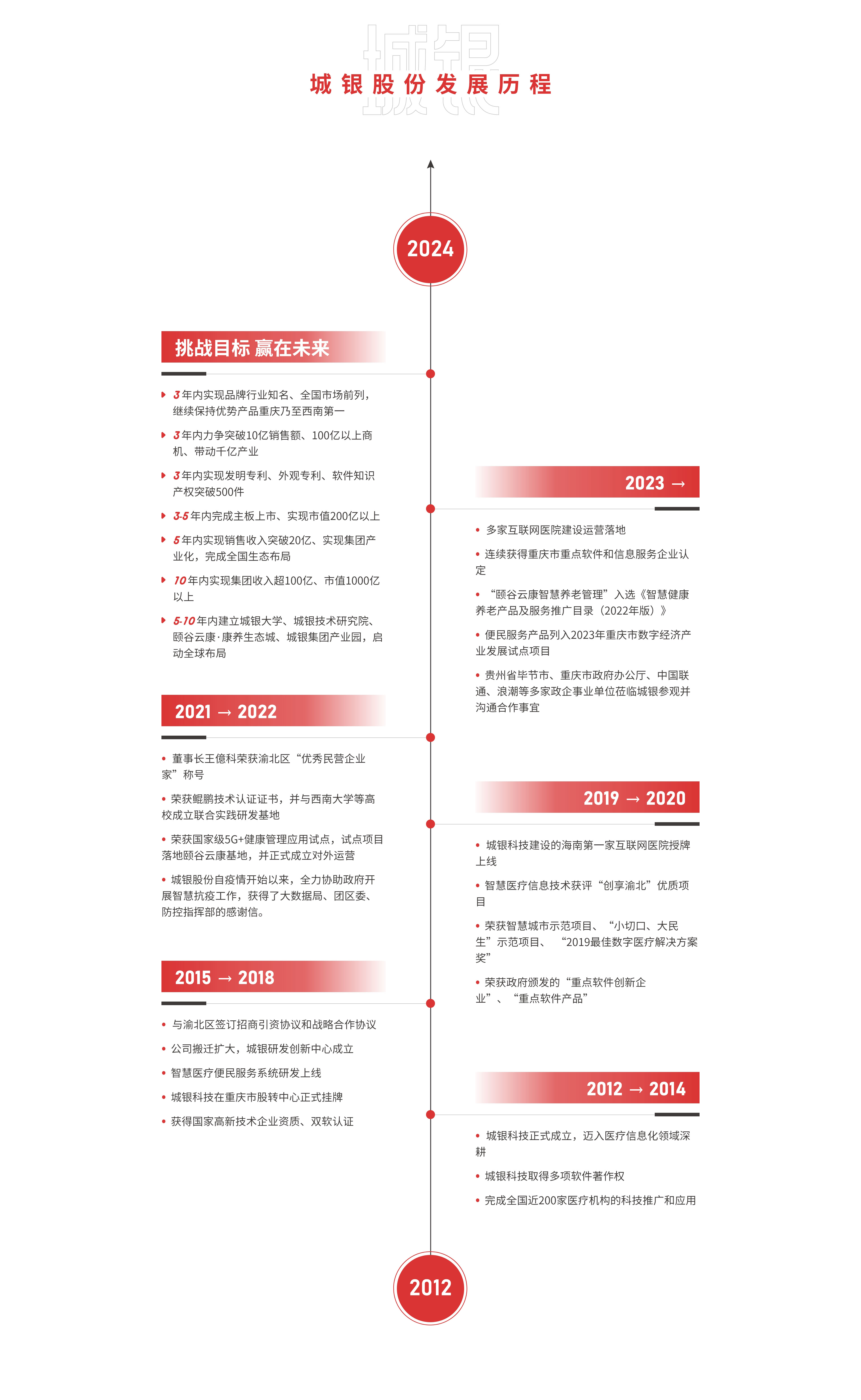 城銀股份是一家基于信息化、智能化、大數據、物聯網的整體解決方案技術服務提供商,專注數智化醫康養服務12年+。公司總部位于重慶,并在深圳擁有獨立的生產制造基地,全國共構建8個大型市場服務區域,在各個地區均分布有辦事處或分公司,支持為客戶群提供快速便捷的本地化服務。公司于2018年正式在股權中心掛牌(股權代碼:850107),經過多年發展企業資質完善,并榮獲國家高新技術企業、“專精特新”企業、重點軟件企業、企業技術研發中心、CMMI國際認證、ISO9001質量管理體系認證、知識產權體系認證、電子智能化資質、信息集成安全服務認證、ITSS認證等各種榮譽和資質認證,獲取了超過180項包括專利在內的自主知識產權,產品廣泛應用于政府以及上千家企事業單位。