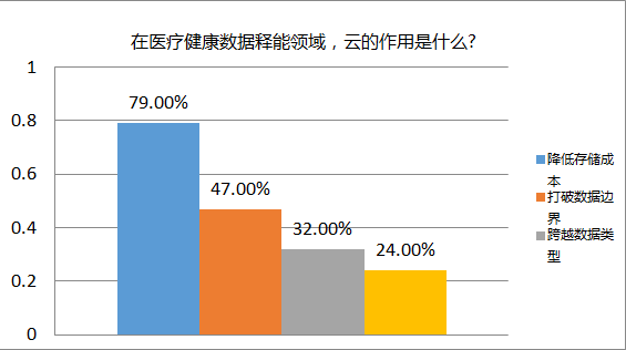 從醫療健康數據釋能角度來看,79%調查對象認為云可以降低存儲成本,從存儲效率和單位存儲價格方面,云存儲都更有優勢;47%調查對象認為上云更有助于打破數據邊界,不必收到物理存儲的局限從而形成數據孤島;32%調查對象認為上云可以幫助他們跨越數據類型,應對結構化數據、非結構化數據并存的局面;另有24%調查對象認為上云能夠幫助他們擺脫供應商掣肘,不必擔心被某個供應商綁架。