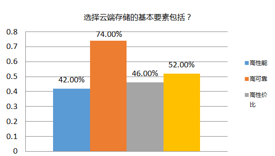 74%調查對象認為,高可靠是云選型的重要因素;52%調查對象認為,運維簡便非常重要;46%調查對象認為高性價比是選擇云存儲的重點;42%調查對象認為高性能是選擇云的考量因素。