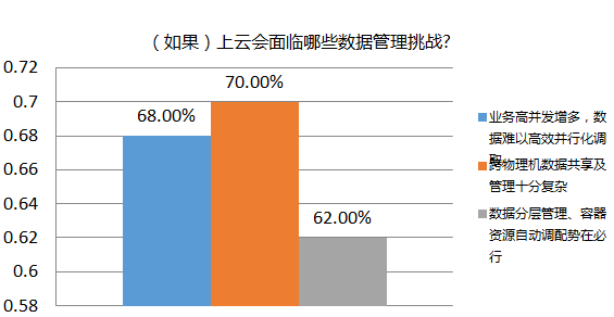 70調查對象認為,上云可能會造成跨物理數據共享問題,使數據管理更加復雜。發展30年,不同時期、不同應用的數據存儲方式有所不同,新來的云存儲作為其中的全新模式,將會給信息管理人員帶來新的問題。