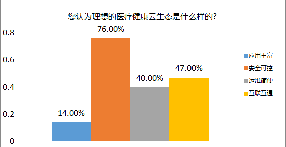 調研對象中,76%認為安全可控就是理想的云生態;47%認為云生態內部需要互聯互通,從業務到數據都要整合實現協同服務;40%認為越來越豐富的云應用需要簡化操作,因此運維簡便也是一個醫療健康云生態的重要屬性;14%認為云生態上需要有豐富的應用,如果能夠在一朵云上獲得大部分應用,應用管理就會變得無比簡單。